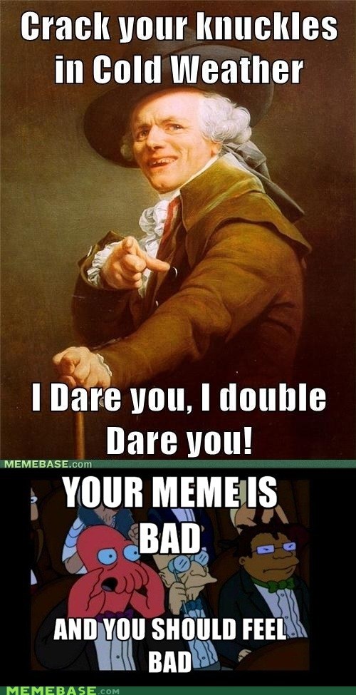 Only personal attacks are removed otherwise if it s just content you find offensive you are free to browse other websites. Your meme is bad and you should feel bad memes. Although it is usualy used to show tomake known that a meme or some other entity is bad mkay. Only personal attacks are removed otherwise if it s just content you find offensive you are free to browse other websites. The textual content of this image is harassing me or someone i know the visual content of this image is harassing me or someone i know both the textual and visual content are harassing me or someone i know. Meme status confirmed year 2003 origin futurama tags zoidberg catchphrase futurama exploitable music about your music s bad and you should feel bad is a memorable quote from a 2003 episode of futurama online it has become a snowclone your x is bad and you should feel bad most often used in an image macro series featuring the character zoidberg to shame others for actions or. Futurama time travel song.